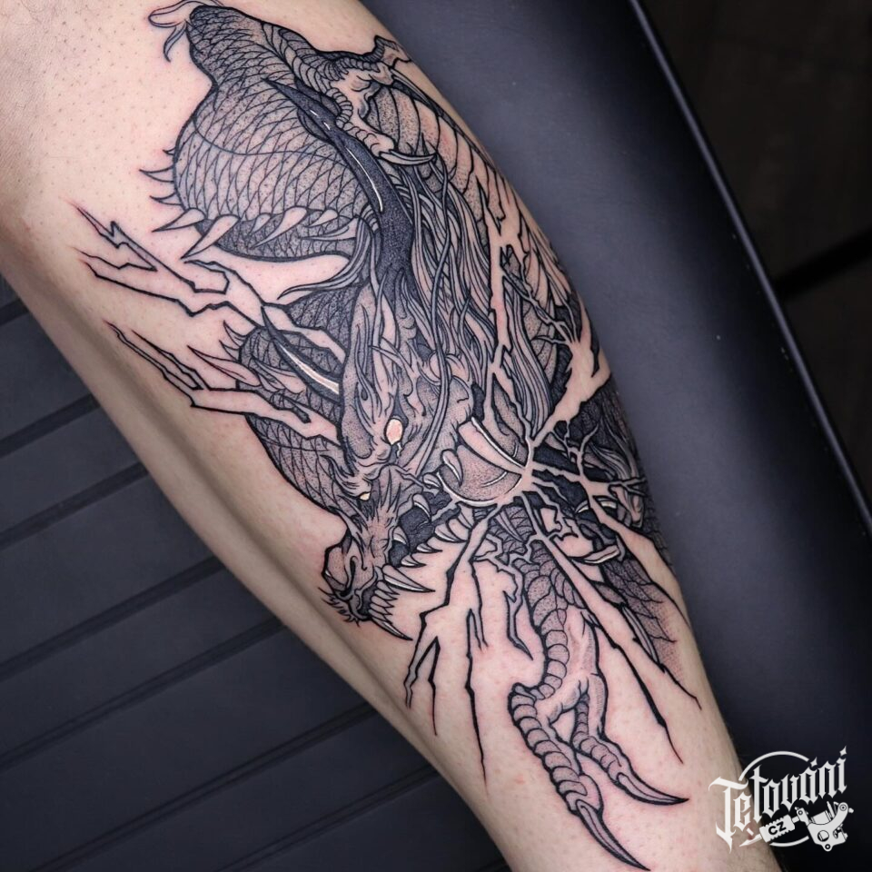Tetování mýtické bytosti, drak na holeni