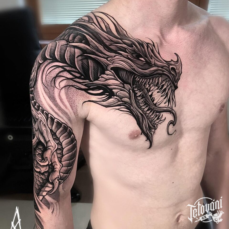 Tetování mýtické bytosti, drak na hrudi