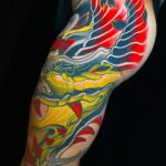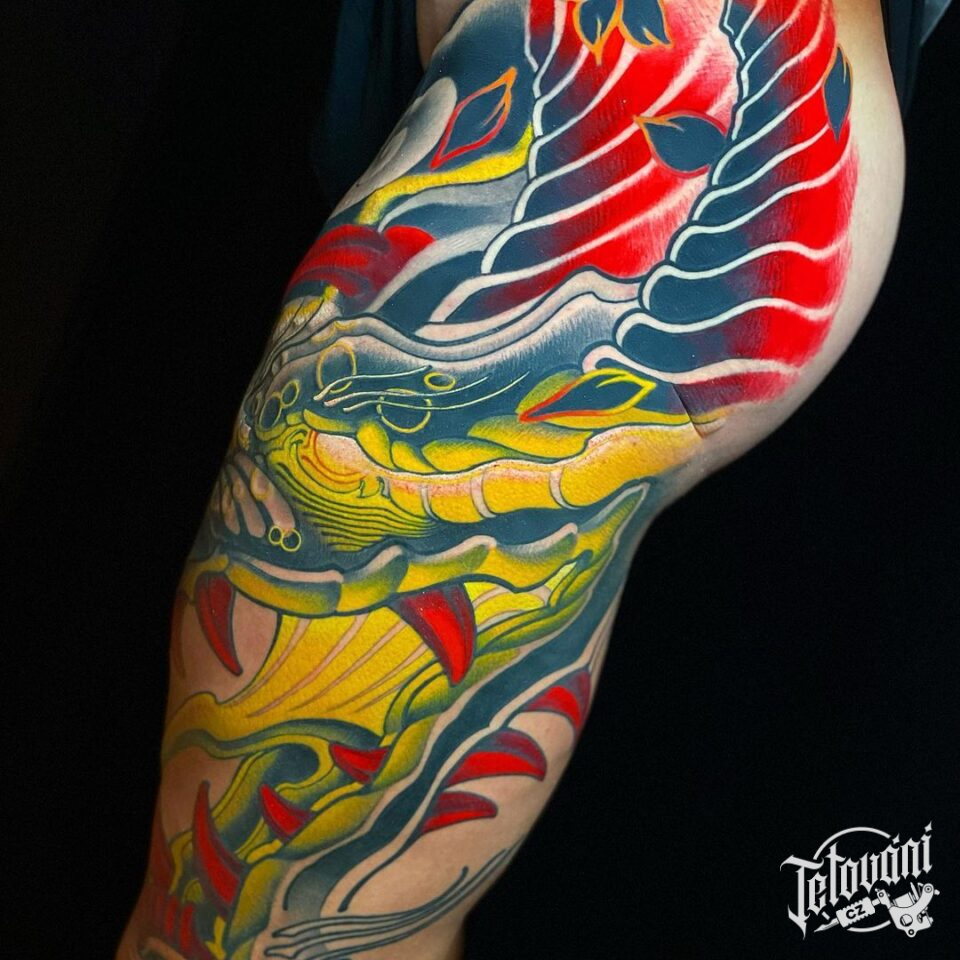Tetování mýtické bytosti, drak na stehnu a zadku
