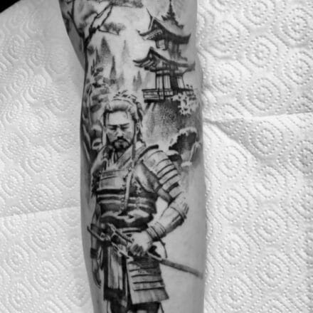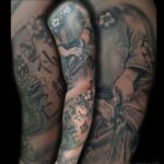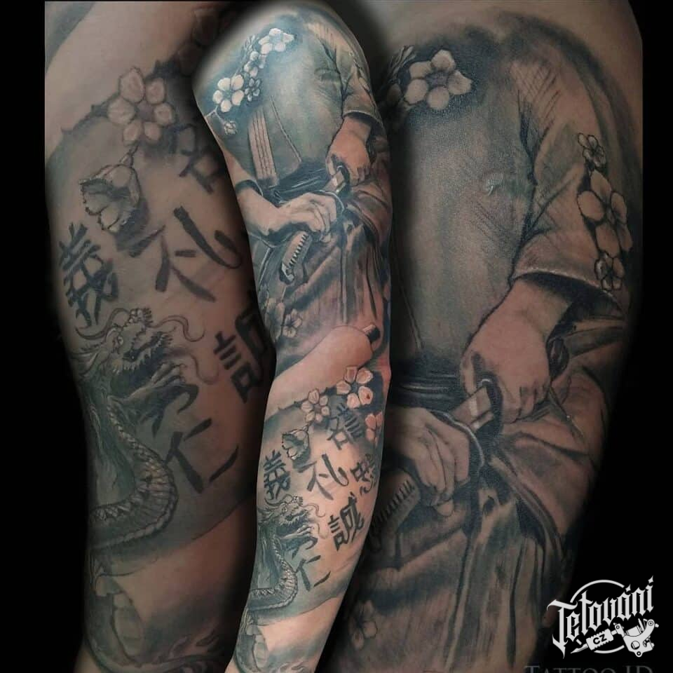 Tetování mýtické bytosti, drak, nápisy, samuraj, rukáv