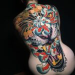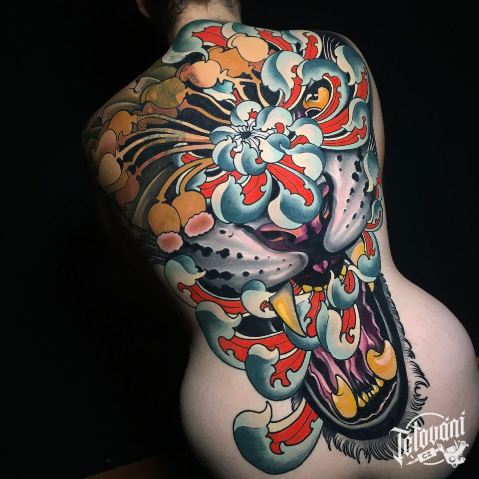 Tetování mýtické bytosti, drak, ornamenty a vlčí mák na zádech