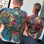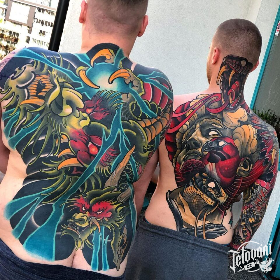 Tetování mýtické bytosti, drak, portréty, zvířata, pták a had na zádech