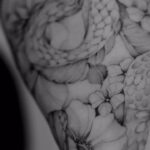 Tetování mýtické bytosti, drak s květinami na předloktí