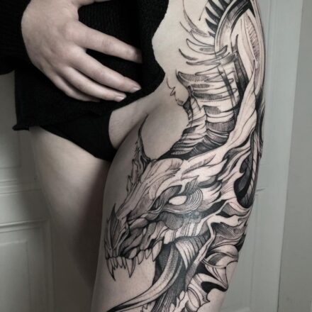 Tetování mýtické bytosti, drak, samuraj a sakura na rukávu