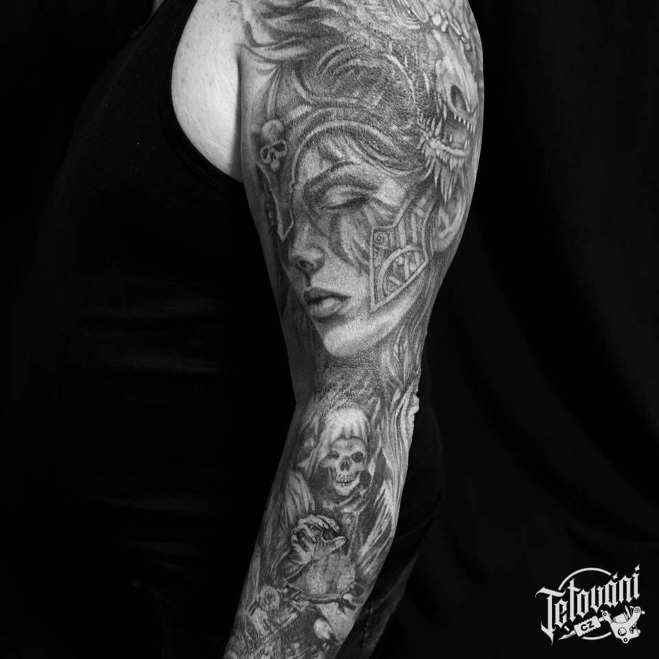 Tetování mýtické bytosti, drak, Valkýra, smrtka, rukáv