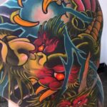 Tetování mýtické bytosti, drak, zvířata, hadi a pták, portrét na zádech