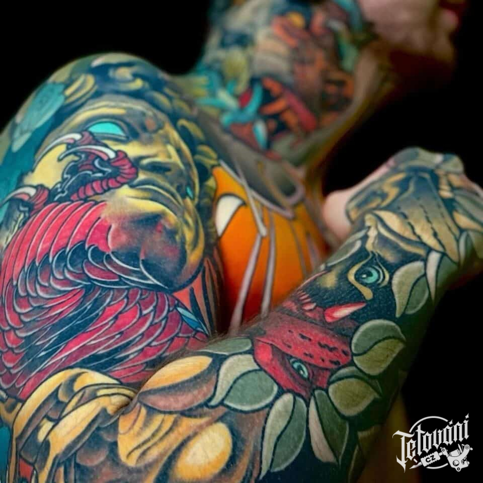 Tetování, mýtické bytosti, drak, zvířata, ptáci a had na rukávu