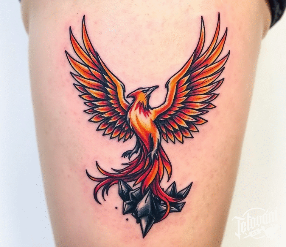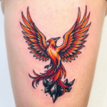 Tetování mýtické bytosti, fénix jako symbol naděje na boku stehna
