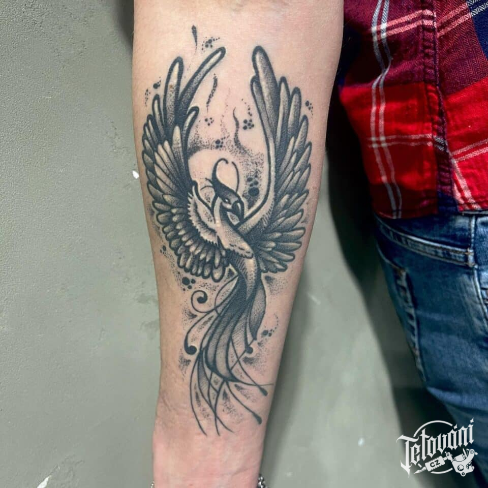 Tetování mýtické bytosti, fénix na předloktí