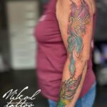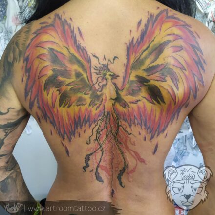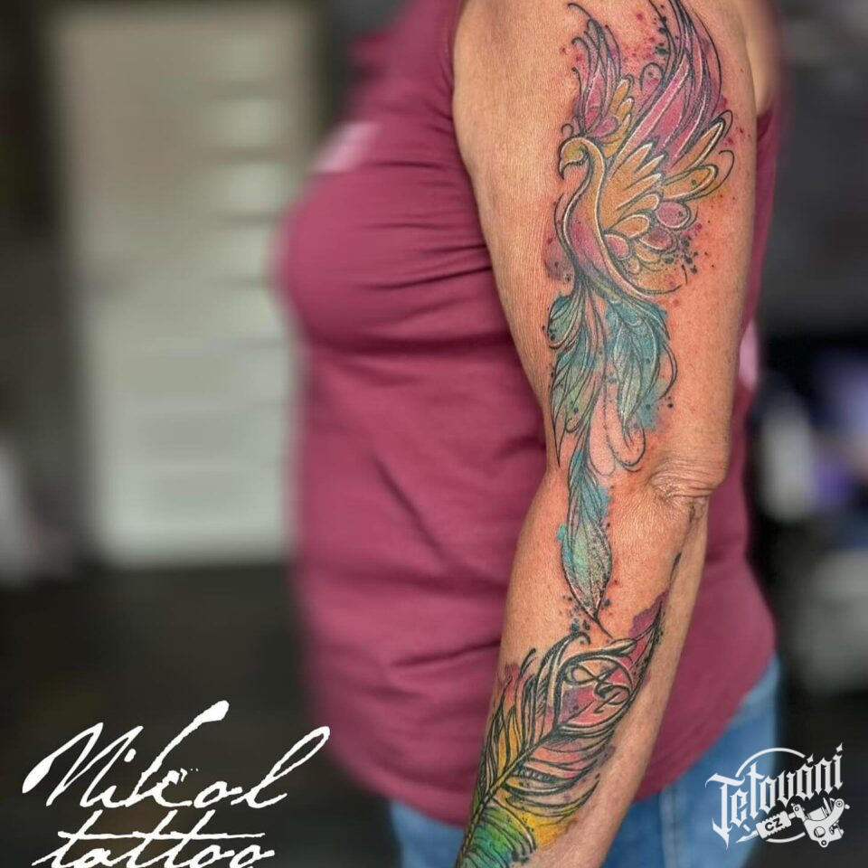 Tetování mýtické bytosti, fénix, pírko na rukávu