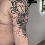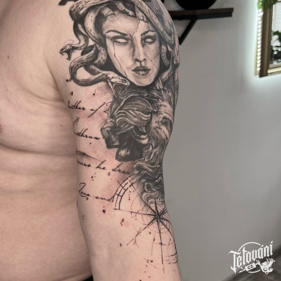 Tetování mýtické bytosti, mýtická medúza, kompas a nápisy, citát na rameni