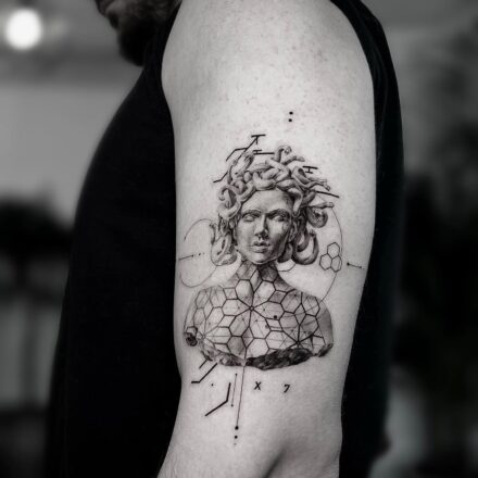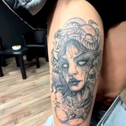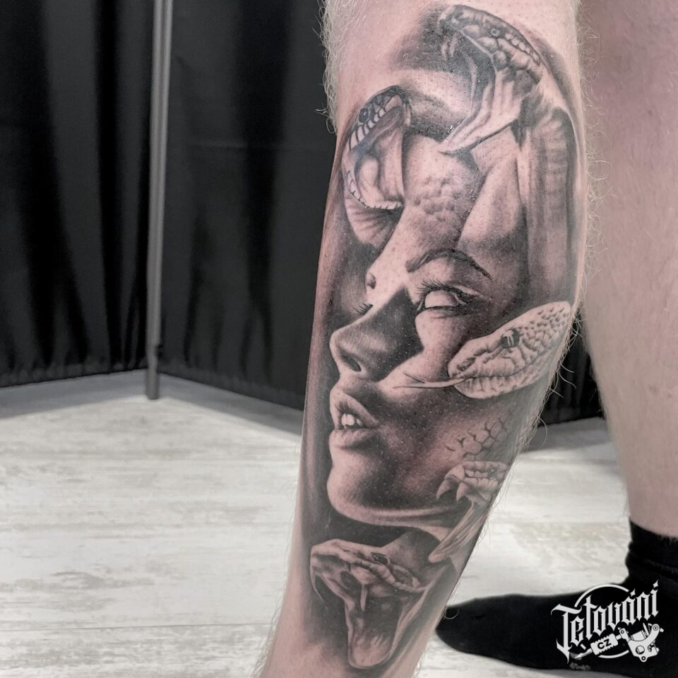Tetování mýtické bytosti, mýtická medúza na lýtku
