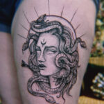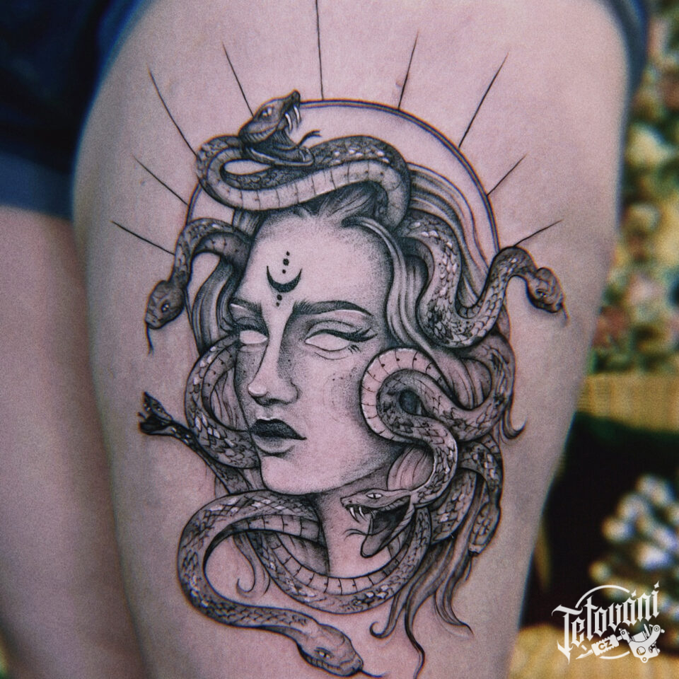 Tetování mýtické bytosti, mýtická Medúza na stehno