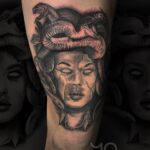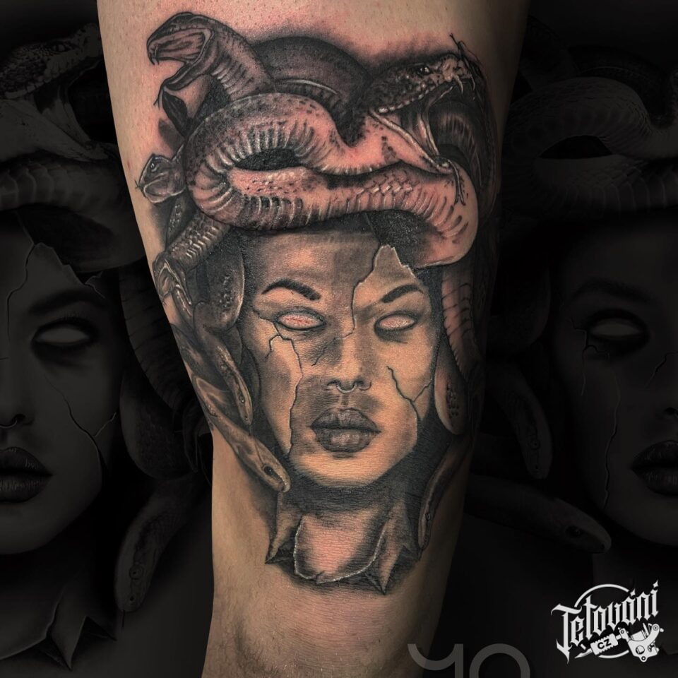 Tetování mýtické bytosti, mýtická medúza na stehno