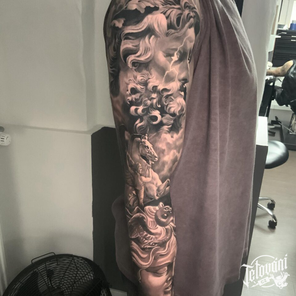 Tetování mýtické bytosti, mýtická medúza, Zeus, rukáv