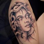 Tetování mýtické bytosti, portrét Medúzy na stehně