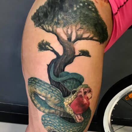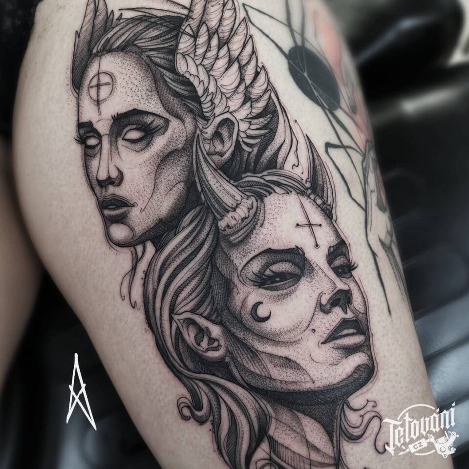 Tetování mýtické bytosti, portrét Valkýry a Ďáblice na stehně