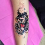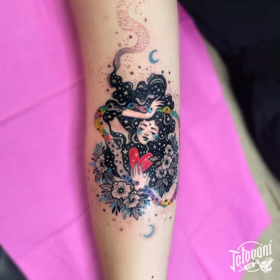 Tetování mýtické bytosti, srdce, květiny na předloktí