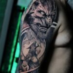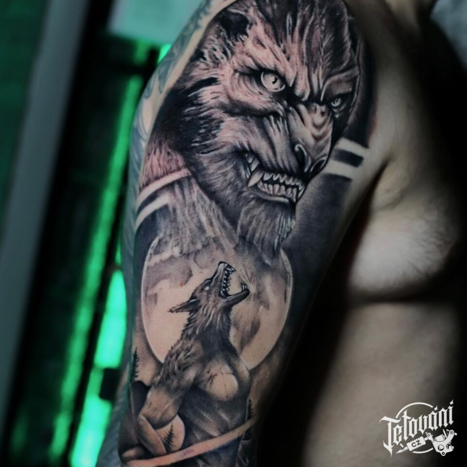 Tetování mýtické bytosti, vlkodlak na rameni