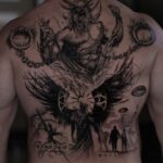 Tetování mýtické bytosti, vojáci, latinské citáty, anděl smrti na zádech
