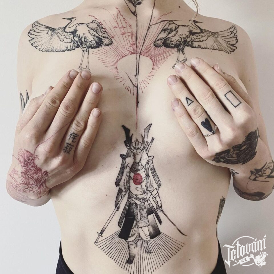 Tetování na břicho hrudník, samuraj, zvířata, ptáci