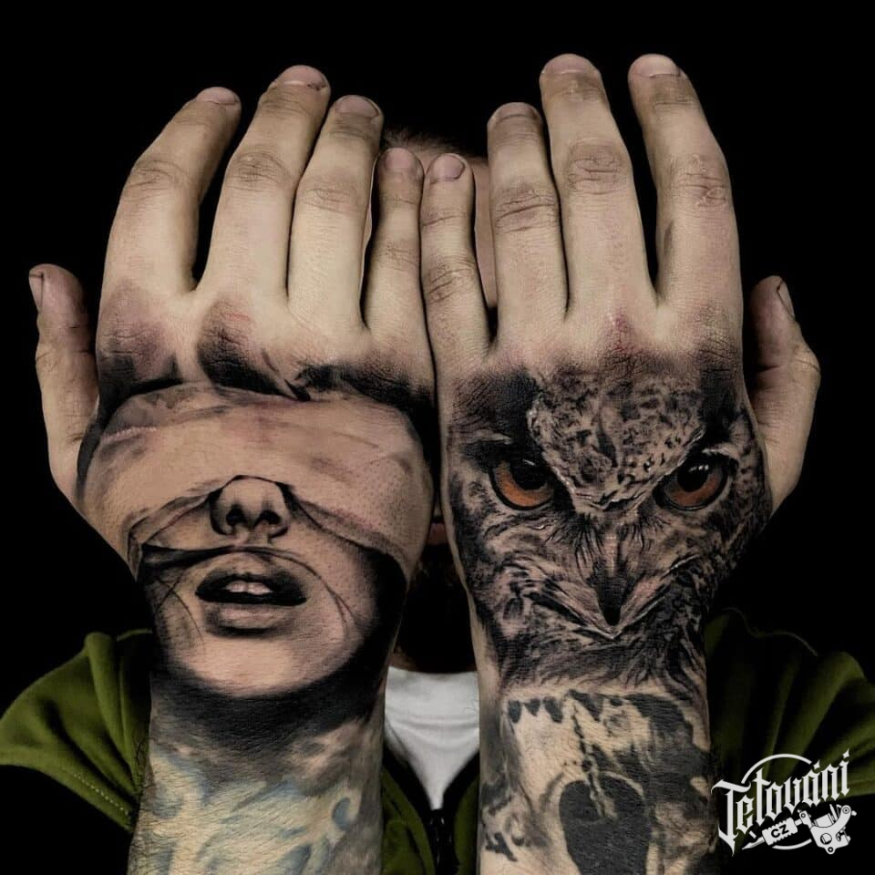 Tetování na dlaně, zvířata, sova, žena