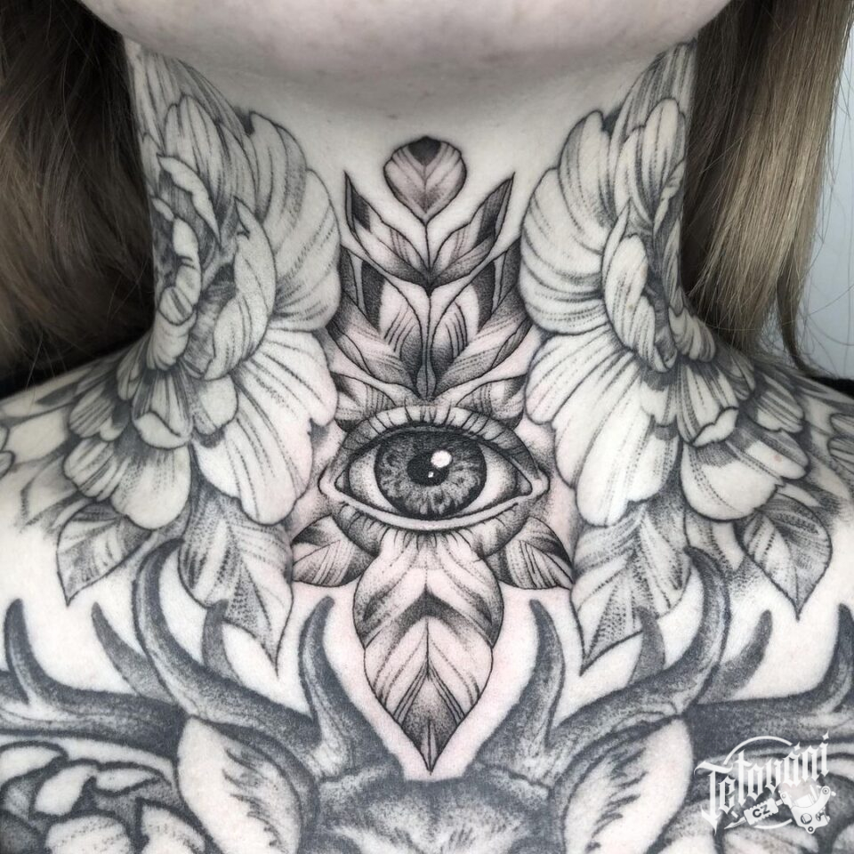Tetování na krk, oko, květiny