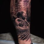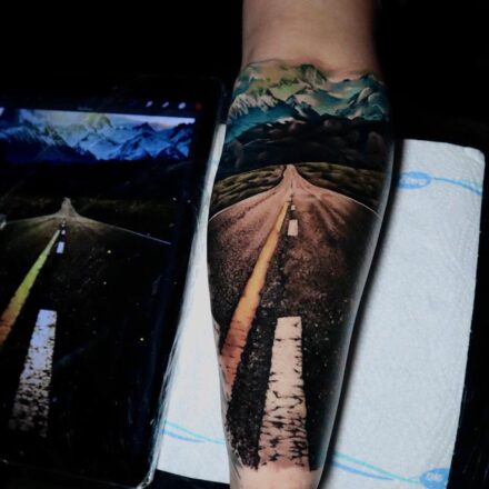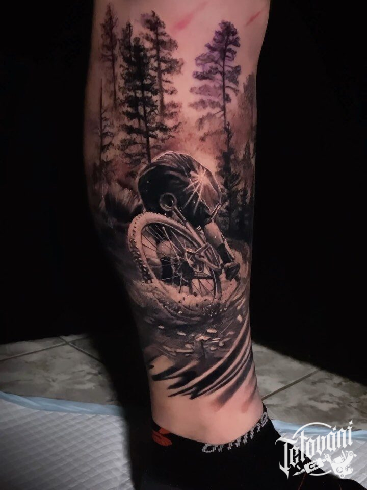 Tetování na nohu, kolo, příroda, cesta, les