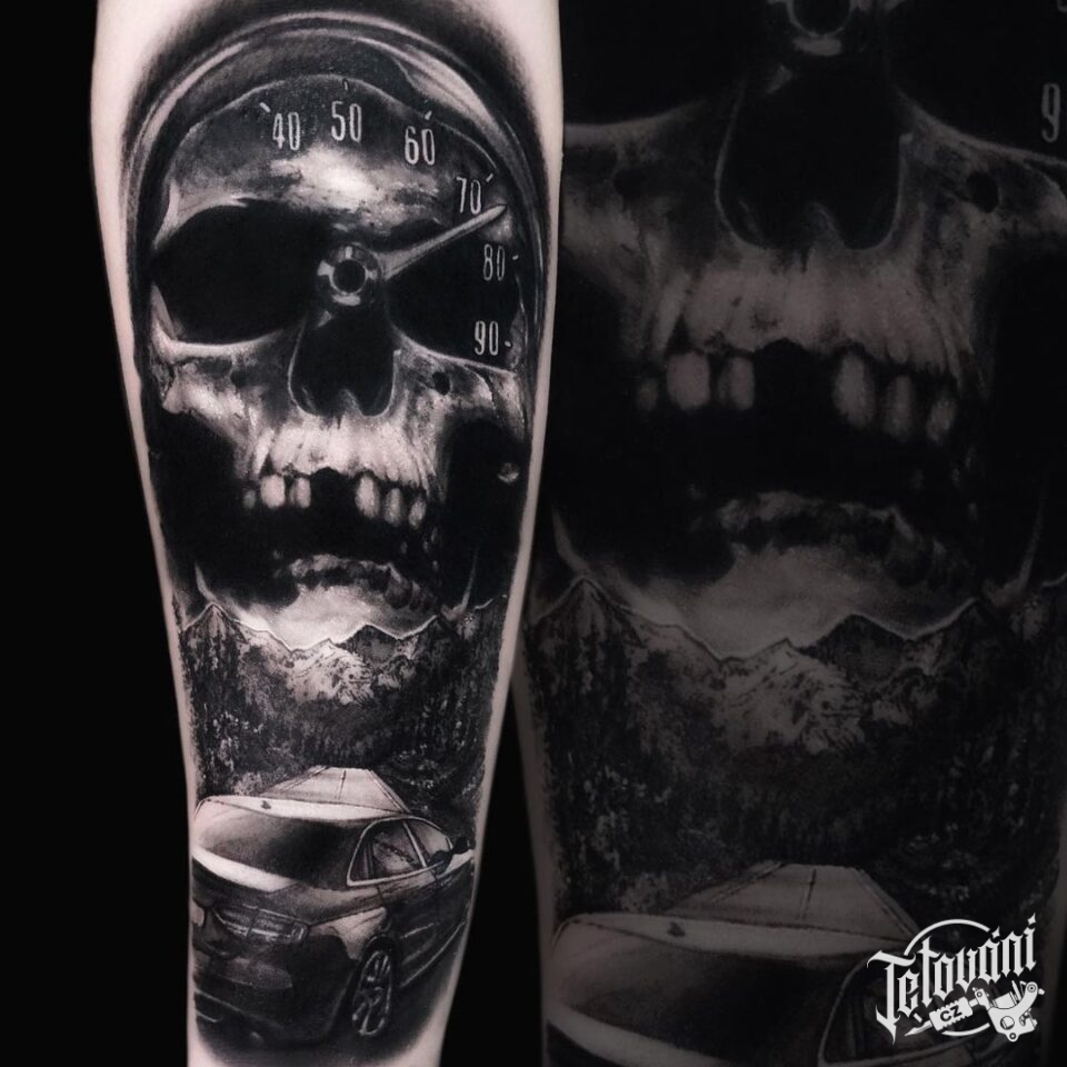 Tetování na ruku, lebka, auta