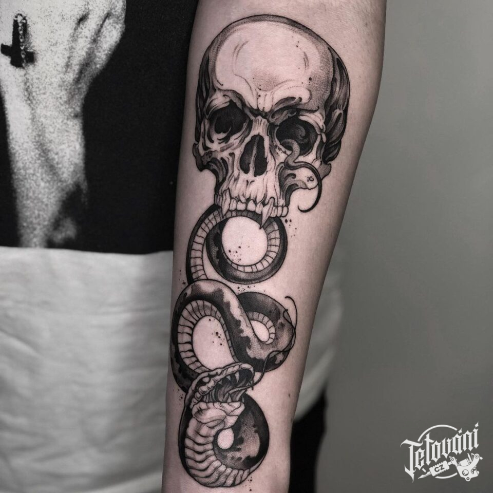 Tetování na ruku, lebka, zvířata, had
