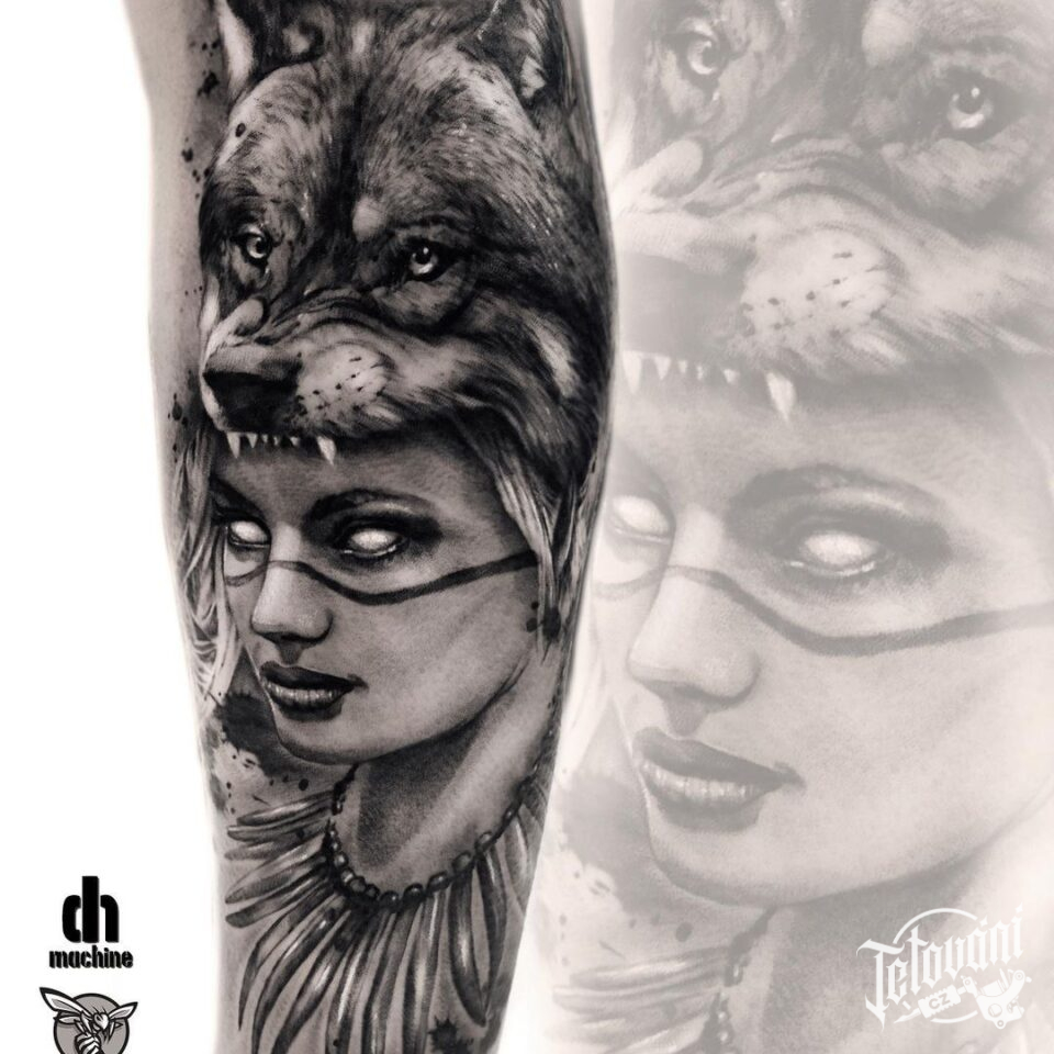 Tetování na ruku, žena, zvířata, vlk