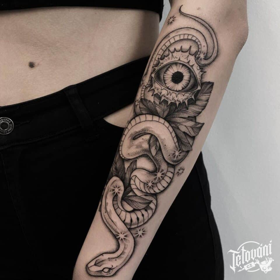Tetování na ruku, zvířata, had, oko