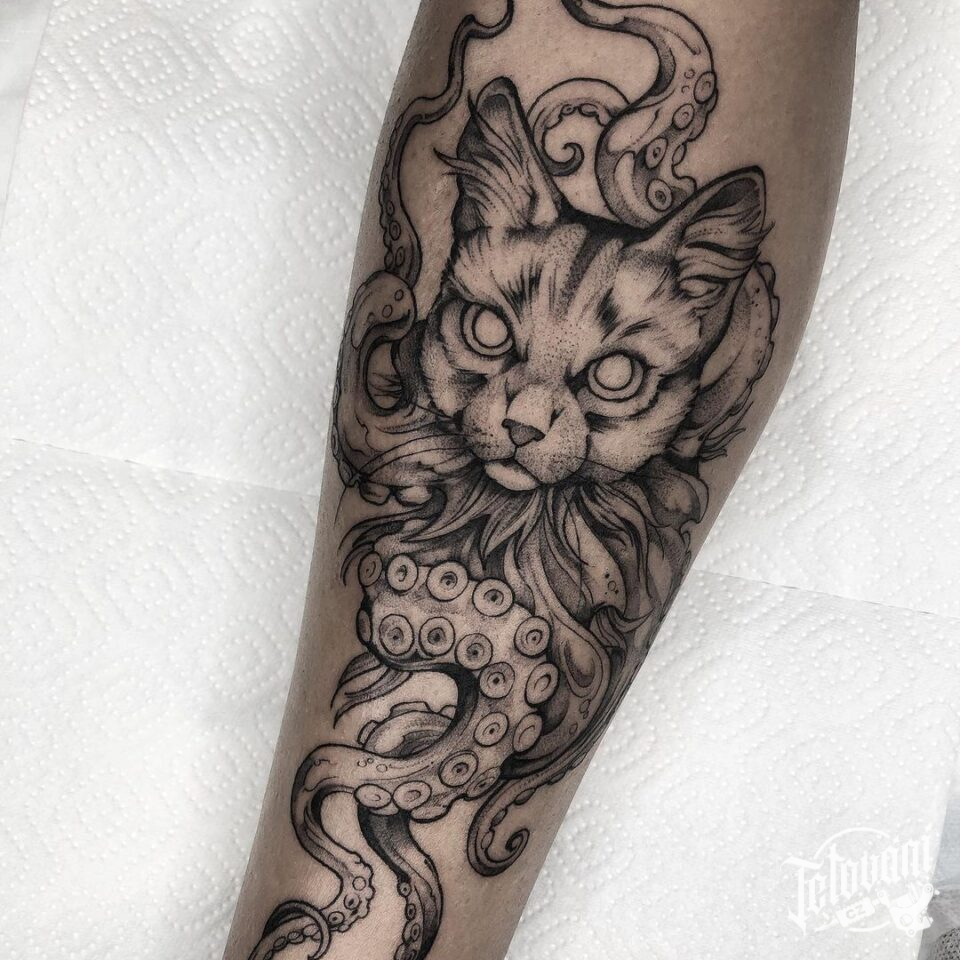 Tetování na ruku, zvířata, kočka, chobotnice