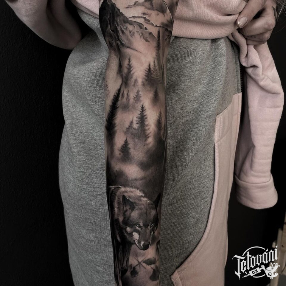 Tetování na ruku, zvířata, vlk, příroda, les, hory