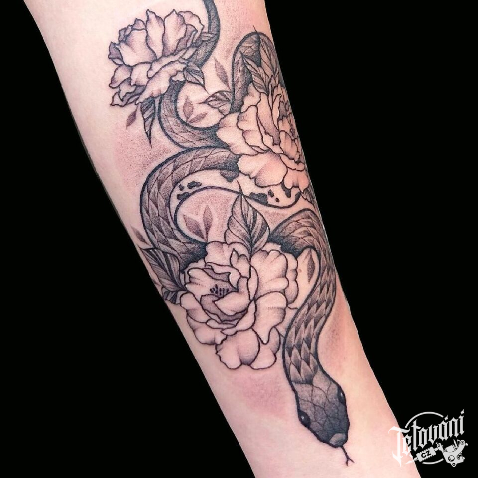 Tetování na ruku, zvíře, had, květiny