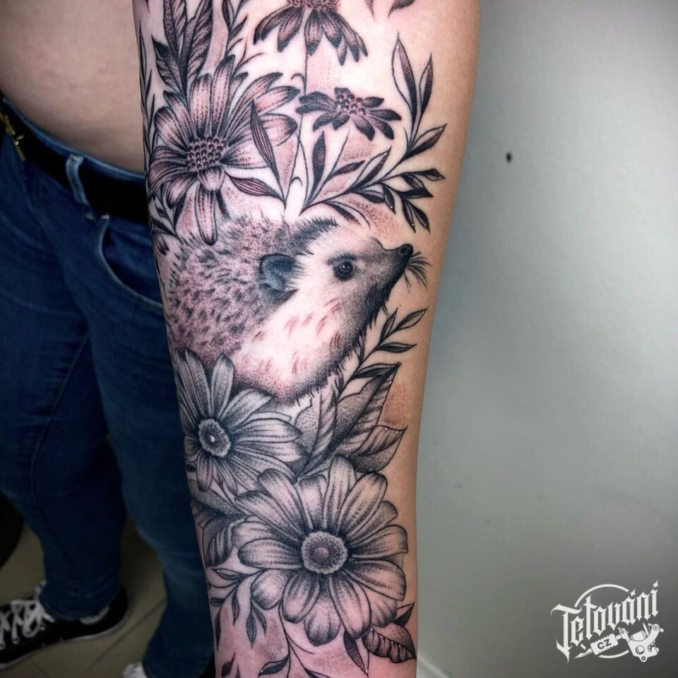 Tetování na ruku, zvíře, ježek, kvetiny