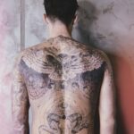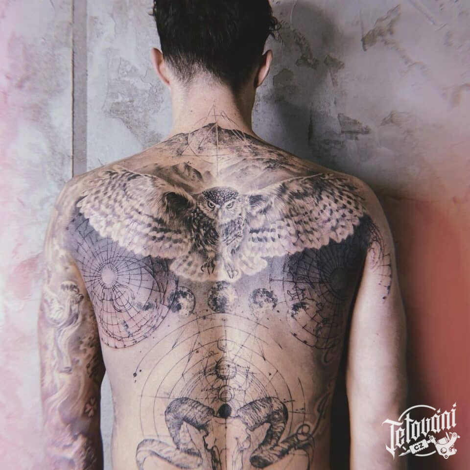Tetování na záda, zvířata, sova, vesmír, planety, lebka