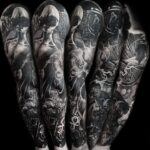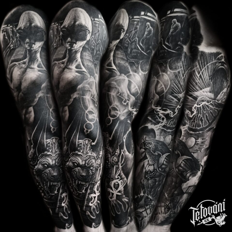 Tetování náboženské bytosti, Anubis a UFO, rukáv