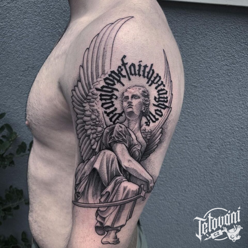 Tetování náboženství a tetování anděl a nápis na rameni