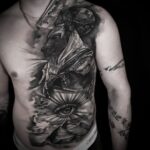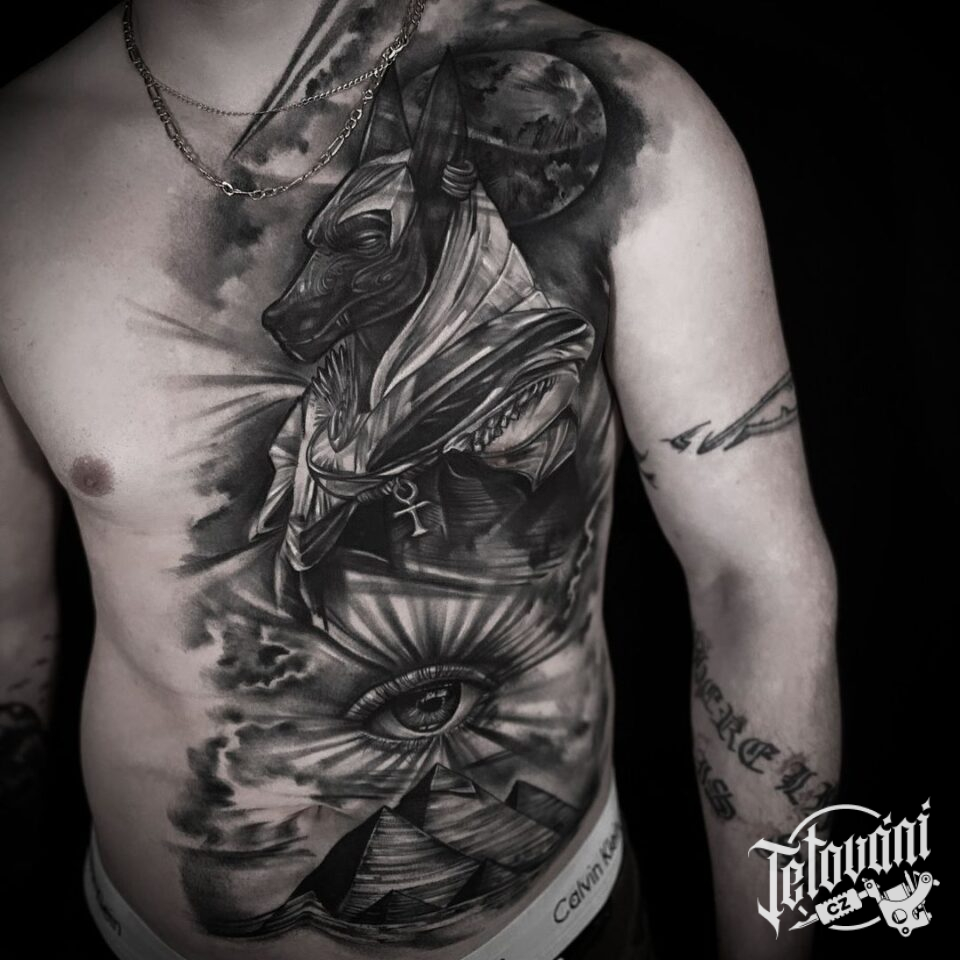 Tetování náboženství Anubis a oko na hrudníku