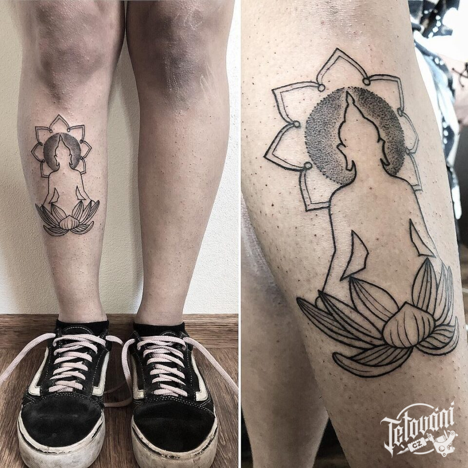 Tetování náboženství, Buddha, mandala, květina lotus na holeň