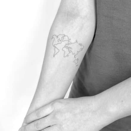 Tetování náboženství, cestování, planeta a písmena na předloktí