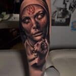 Tetování náboženství, jeptiška, portrét, ďábel na lýtko