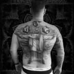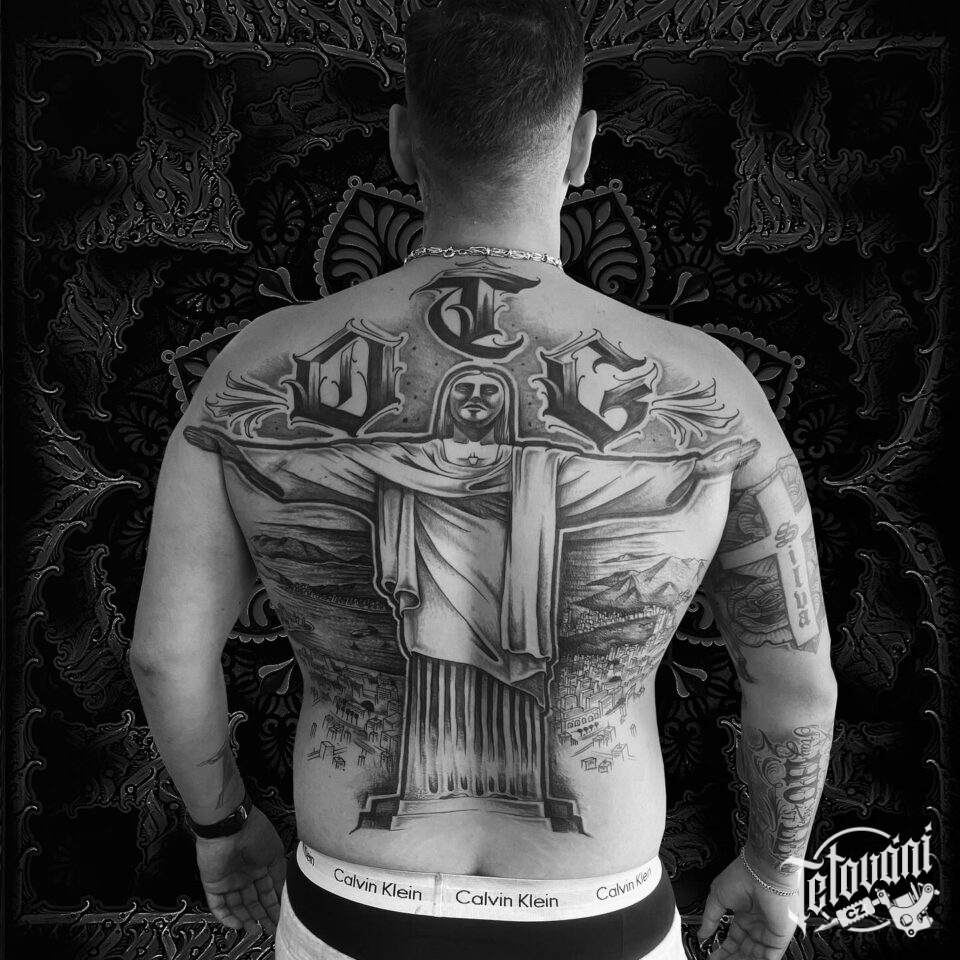 Tetování náboženství Ježíš Kristus s písmeny, nápisy na záda