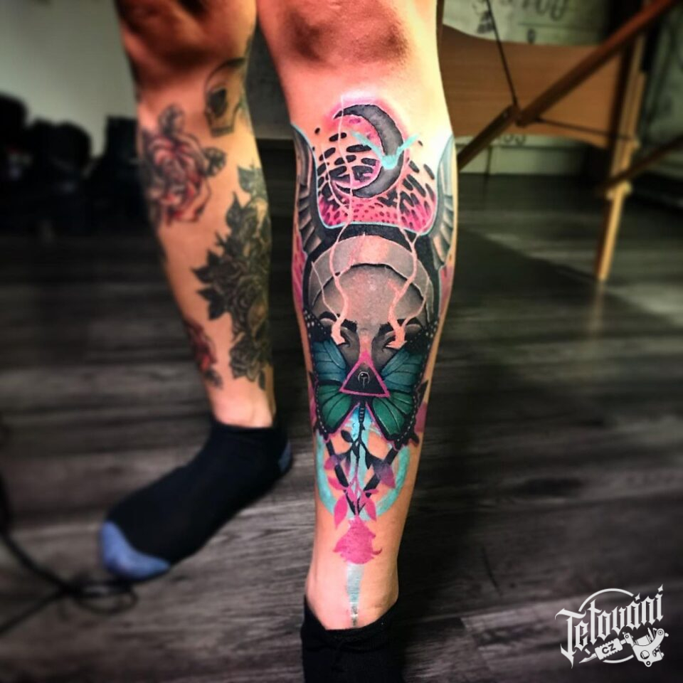 Tetování náboženství, květina, růže, zvíře, motýl, měsíc na holeň
