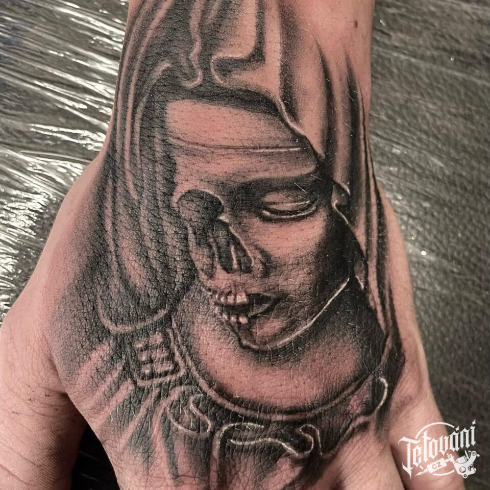 Tetování náboženství Panna Marie na hřbet ruky