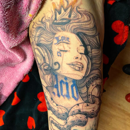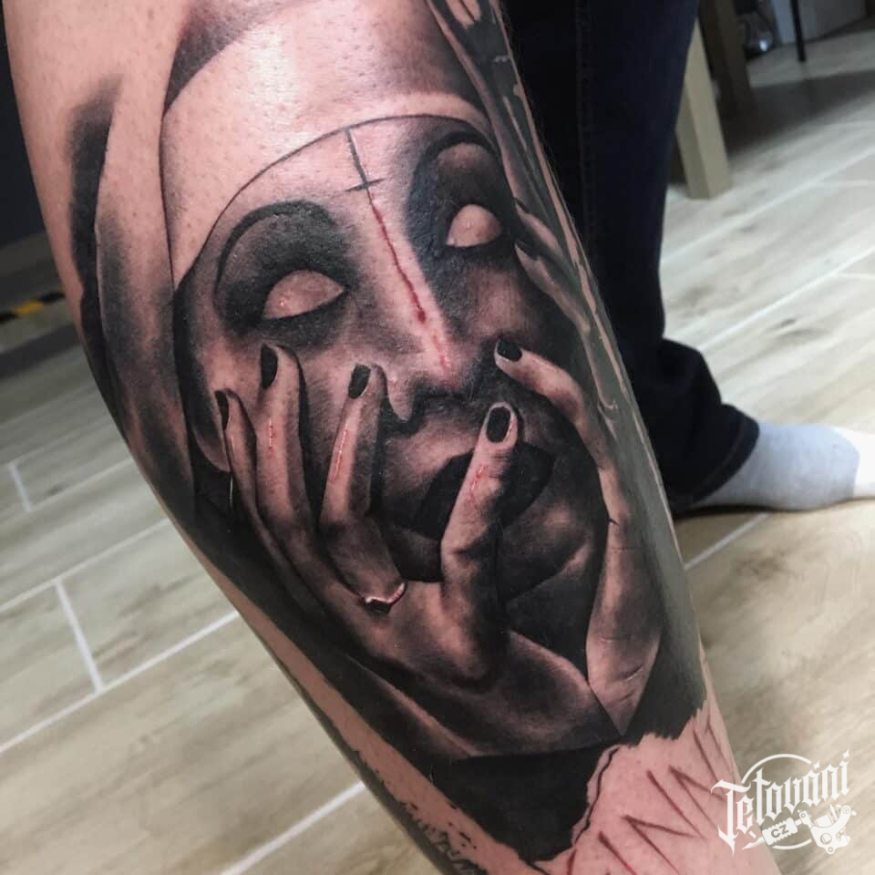Tetování náboženství, portrét jeptišky, kříž na holeň
