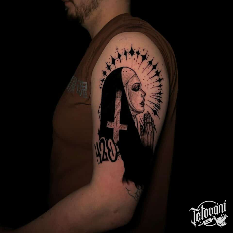 Tetování náboženství, portrét jeptišky na rameni