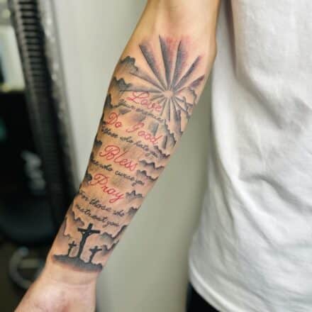 Tetování náboženství, portrét Ježíše a zvířata, pták, holubice a nápisy, citát na rukáv
