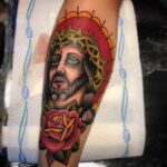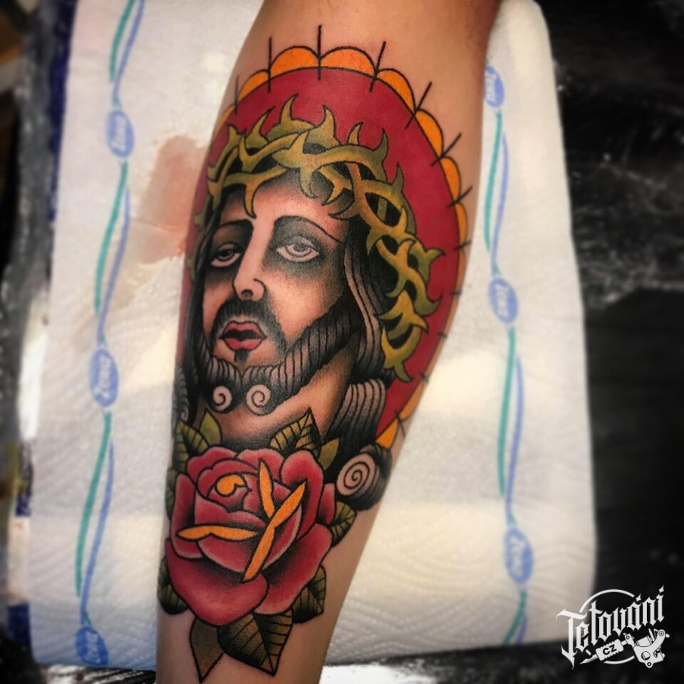 Tetování náboženství, portrét Ježíše Krista na lýtku